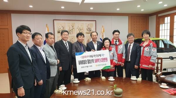 강원인삼농협(조합장 최진현)은 코로나19 방역 의료진 면역증진과 피로회복을 지원하기 위해 강원도 6년근 인삼을 원료로 한 퓨어데일리 홍삼스틱 500박스(3천만원)를 3월 9일 도청 통상상담실에서 최문순 도지사가 참석한 가운데 대한적십자사 강원도지사(회장 이돈섭)에 기증했다.