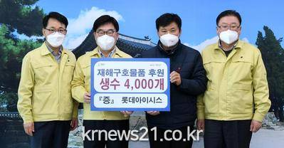 ▲ [사진제공 = 광주시]롯데아이시스는 11일 광주시를 방문, 코로나19 확산 방지를 위해 생수(500㎖) 4천개를 기탁했다.