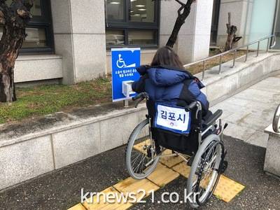 ▲ [사진제공 = 김포시]김포시(시장 정하영)는 장애인 및 노약자 등 사회적 약자의 편의를 위해 도움벨을 청사 내 민원동 입구 장애인 경사로, 장애인용 화장실, 무인민원발급기 등에 설치했다.