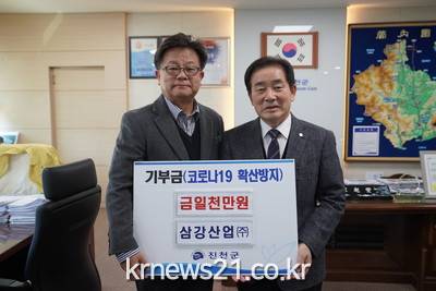 진천 백곡면 소재 삼강산업(주) 우정식 대표 외 2명은 11일 진천군청을 찾아 코로나19 감염증으로부터 어려움을 겪고 있는 저소득가구를 위해 사용해 달라며 현금 1,000만원을 기탁했다.