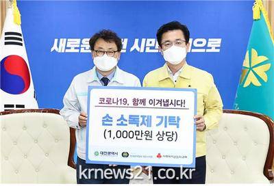 ▲ [사진제공 = 대전광역시]대전시는 12일 오후 2시 40분 응접실에서 한국방역협회 대전시지회가 1,000만원 상당의 코로나19의 예방물품을 기탁했다고 밝혔다.