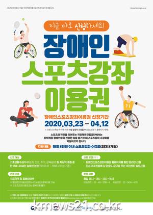 국민체육진흥공단은 3월 23일(월)부터 4월 12일(일)까지 장애인스포츠강좌이용권 대상자 신청을 받는다. 특히 코로나19 예방을 위해 가급적 누리집(dvoucher.kspo.or.kr)을 통한 비대면 신청을 중심으로 운영한다.