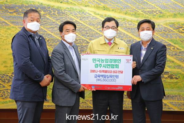 (사)한국농업경영인 경주시연합회(회장 이이환)는 23일 코로나19로 어려움을 겪는 지역사회 주민들을 위해 경북공동모금회에 686만원을 기탁했다.