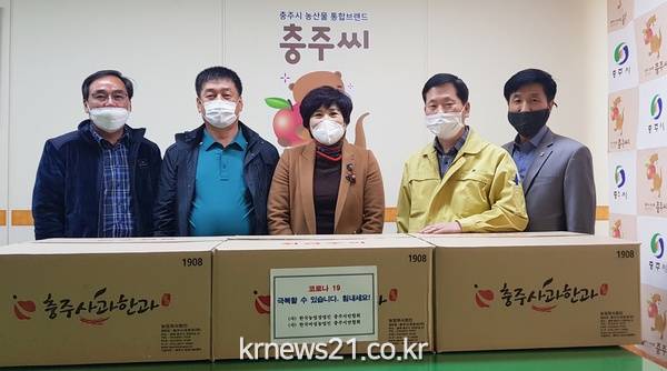 (사)농업경영인충주시연합회(회장 이복해)와 (사)여성농업인충주시연합회(회장 최명길)는 24일 IBK기업은행 충주연수원에 마련된 생활치료센터 입소자 및 의료진들을 위해 사과유과(100만 원 상당)를 기탁했다.