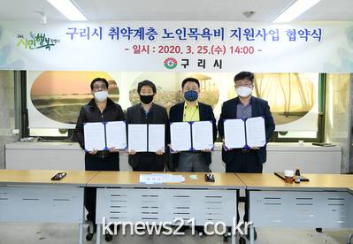 구리시(시장 안승남)는 지난 25일 관내 저소득 취약계층 어르신들의 건강과 위생을 증진하기 위해 신천사우나(대표 전석권) 등 목욕업소 6개소와 목욕비 지원사업 협약식을 가졌다.