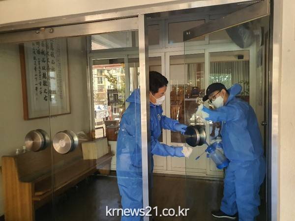 황연동통장협의회(회장 전호규) 통장단과 황연동 직원 등 20여 명이 25일(수) 오후 통리 5일 장터 및 태양의 후예 공원 일원에서 코로나 19 차단을 위한 방역활동을 실시했다.