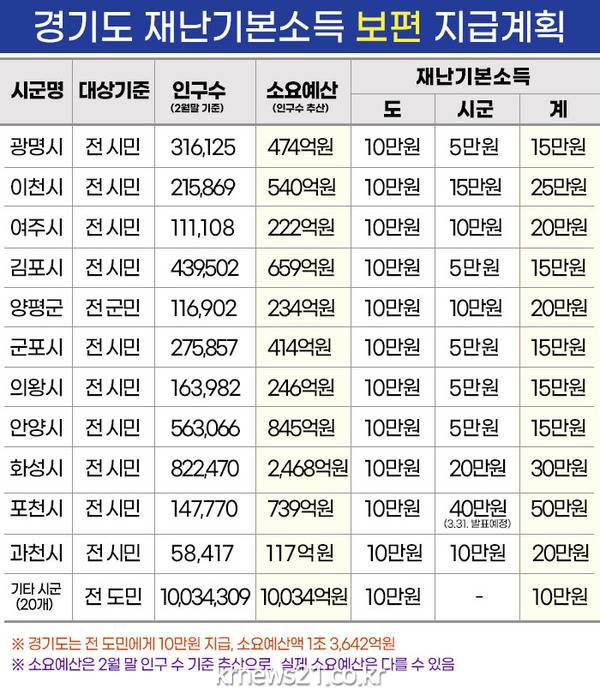 이 가운데 광명과 이천, 여주, 김포, 양평, 군포, 의왕, 안양, 화성, 포천, 과천 등 11개 시·군은 5만 원에서 최대 40만 원까지 모든 시·군민에게 재난 기본소득을 지급할 예정이다.