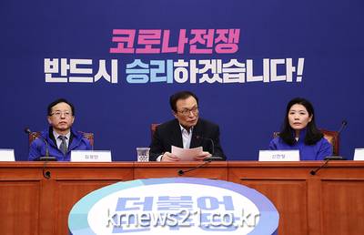 민주당은 29일 국회 기자간담회에서 메인 슬로건 ‘국민을 지킵니다! 더불어민주당’ ‘코로나 전쟁 반드시 승리합니다’을 공개하며 정부와 함께 코로나19 사태에서 국민을 지키고 위기를 극복할 수 있다는 점을 강조했다. 유세단 공식 명칭도 ‘국민지킴유세단’으로 정했다.