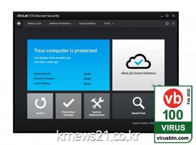 ▲ [이미지제공 = 안랩]안랩(대표 권치중)의 통합 PC 보안 솔루션 ‘V3 Internet Security 9.0(이하 V3)’이 글로벌 안티바이러스 평가 기관 ‘바이러스 불러틴(Virus Bulletin)’이 실시하는 2020년 첫 ‘VB100’ PC 보안제품 인증 평가에서 진단율 100%로 인증을 획득했다.