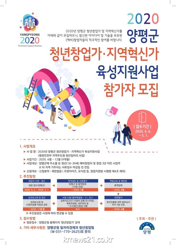 양평군이 오는 4월 6일부터 5월 1일까지 ‘양평군 청년창업가/지역혁신가 육성지원사업’의 참여자를 모집한다.
