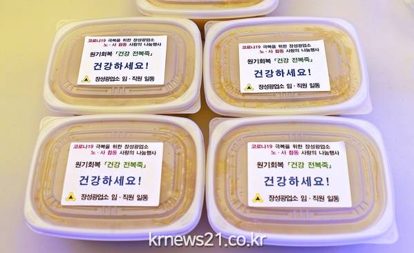 코로나19 극복을 위한 장성광업소 노‧사 합동 사랑의 나눔행사 지원금으로 마련된 오늘 행사는 장성동 관내 65세 이상 독거어르신들의 원기회복을 위한 자리로, 12개 민간단체 회원 50명이 전복죽 조리와 배달 봉사에 참여했다.