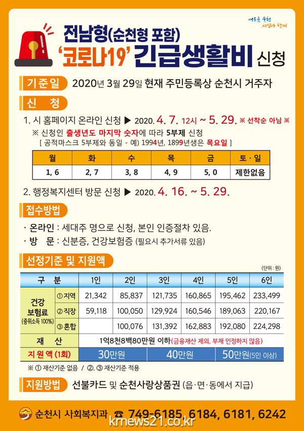 지원 근거는 전라남도와 순천시 저소득주민생활안정지원조례로 기준일은 3월 29일 현재 주민등록상 순천시 거주자다. 지원액은 1~2인 가구 30만원, 3~4인 가구 40만원, 5인 이상 가구는 50만원이며, 선불카드 및 순천사랑상품권으로 1회 지원한다.