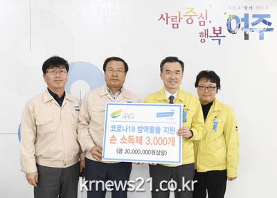 이항진 시장은 “평소 여주시 지역발전에 적극 협조하고 있는 한국콜마에서 이번에 손 소독제를 기증해주신데 감사드린다.”며 “각지에서 보내주시는 마스크, 소독제 등 기증해주신 방역물품은 코로나 예방을 위해 소중히 활용하겠다.”고 말했다.