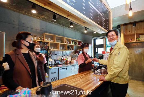류태호 시장은 간단한 기념 촬영 후 즉시 청사 내 산소 휴드림 카페에 들러, 탄탄페이로 음료 값을 직접 결제하기도 했다.