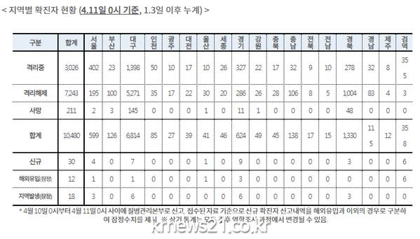 질병관리본부 중앙방역대책본부는 11일 0시 기준 누적 확진자는 1만480명이라고 밝혔다. 사망자는 3명 늘어나 211명이다.