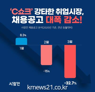 1분기 평일 평균 채용 공고 등록건수를 보면, 1월은 전년 동월 대비 8.3% 상승한 반면, 코로나19 집단 감염이 발생한 2월은 15%가 줄었고, 경제 전반에 C쇼크가 밀어닥친 3월에는 무려 32.7%가 감소한 것으로 집계됐다.