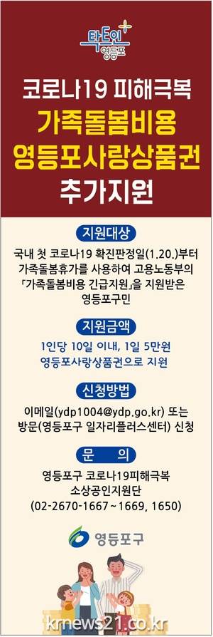 채현일 영등포구청장은 “코로나19의 장기화로 무급 가족 돌봄 휴가를 사용하는 구민의 경제적 어려움을 덜고자 ‘영등포사랑상품권’을 1인 최대 50만원 지원하게 됐다”라며 “영등포구는 구민을 위한 든든한 지원군이 되기 위해 최선을 다하겠다”라고 전했다.