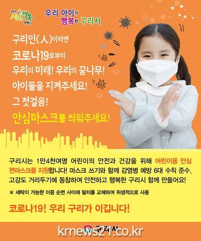 ▲ [사진=홍보포스터]구리시재난안전대책본부(이하, 재대본. 본부장 구리시장 안승남)는 13일 코로나19 감염으로부터 어린이를 보호하기 위한 대책의 일환으로 영·유아 및 초등학생 1, 2학년을 대상으로‘어린이 전용 면마스크’2매와 교체형 KF94 필터 1세트(10매)를 지원한다고 밝혔다.