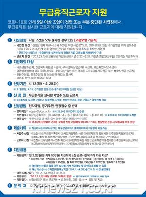 ‘코로나19 피해사업장 무급휴직근로자 지원사업’의 지원대상은 코로나19로 인해 조업이 전면 또는 부분 중단된 대구시 소재 100인 미만 사업장*에서 지난 2.23일**부터 3.31일까지 기간 중 5일 이상 무급휴직을 실시한 경우이며, 해당 근로자에게는 1인당 일 2만 5천원, 월 최대 50만원을 지원한다.