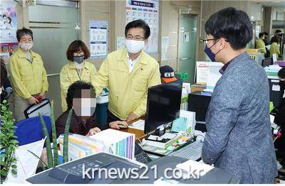 긴급재난지원금 지급을 마친 허태정 시장은, 코로나19로 인한 시설점검, 방역, 선거, 긴급재난지원금 지급 등 지난 2월부터 쉼 없이 일해 온 태평1동 김낙례 동장과 직원들을 격려했다.