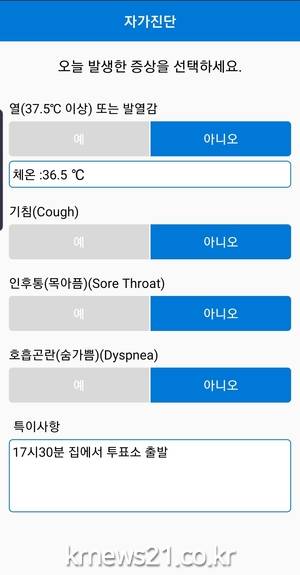 투표를 신청한 자가격리자들은 발열·기침 등 증상이 없으면 오늘 오후 5시 20분부터 오후 7시까지 투표를 위해 외출할 수 있다. 외출할 때는 반드시 마스크를 착용해야 하며 출발할 때와 투표소에 도착했을 때, 투표를 마치고 격리 장소에 복귀했을 때 자가격리 앱이나 문자메시지로 전담 공무원에게 보고해야 한다.