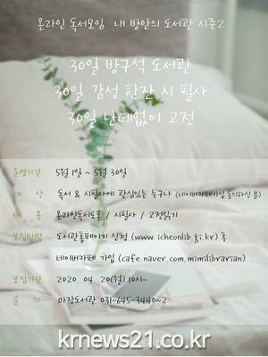 5월 한 달간 진행되는 내 방안의 도서관 시즌2는 4월 20일 오전10시부터 이천시통합도서관 홈페이지를 통해 접수 받으며, 온라인 카페 참여 동의를 하신 이천시민 누구나 참여가능하다.