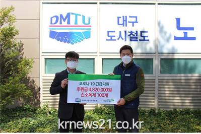 ▲ [사진제공 = 대구광역시]한국노총공공연맹 대구도시철도노동조합(위원장 신기수)은 4월 14일(화) 오전 10시 초록우산 어린이재단 대구지역본부에서 코로나19와 관련한 긴급지원금으로 성금 482만원과 손소독제 100개를 전달했다.