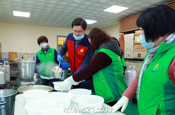 류태호 시장도 자원봉사자들과 함께 삼계탕 포장 작업에 힘을 보탰다.