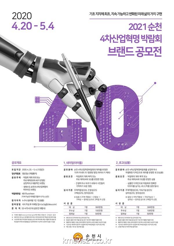 순천시는 2021년에 개최 계획인 ‘4차산업혁명박람회(가칭)’의 테마와 콘셉트를 반영할 수 있는 브랜드를 전 국민 대상으로 4월 20일부터 5월 4일까지 공모한다고 밝혔다.