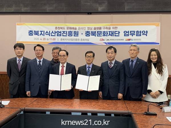 충북문화재단(대표이사 김승환)과 충북지식산업진흥원(원장 노근호)은 ‘충청북도 문화예술 온라인 영상 플랫폼 구축 지원을 위한 업무협약’을 4월 20일, 충북지식산업진흥원에서 체결했다.