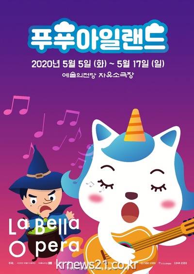 ▲ [사진=홍보포스터]라벨라오페라단이 2020년 5월 5일(화)부터 5월 17일(일)까지 13일간 예술의전당 자유소극장에서 키즈오페라 <푸푸 아일랜드>를 개최한다. 이번 공연은 오페라의 거장 ‘도니제티’의 ‘사랑의 묘약’을 어린이의 눈높이에 맞춰 각색한 작품으로, 48개월 이상부터 관람할 수 있는 어린이 공연이다. 작·편곡은 작곡가 서순정, 대본은 작가 공가희가 맡아 통통 튀는 색다른 어린이 공연을 선보일 예정이다.