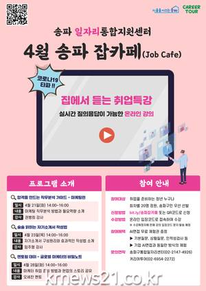 ▲ [사진=홍보포스터]송파구(구청장 박성수)가 코로나19 장기화로 인해 비대면으로 진행하는 취업지원 프로그램 ‘송파 잡 카페’를 4, 5월에도 온라인으로 진행한다고 21일 밝혔다.