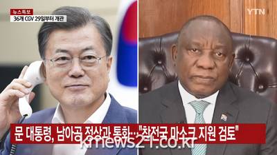문 대통령은 24일 오후 5시부터 25분 동안 마타멜라 시릴 라마포사 남아프리카공화국 대통령과 통화하고 "남아공은 6·25 전쟁에 참전한 우리의 혈맹"이라며 희생에 보답하는 차원에서 한국전쟁 참전국들에 마스크를 지원하는 방안을 검토하겠다고 밝혔다.