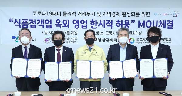 고양시(시장 이재준)는 29일 고양시청 열린회의실에서 한국외식업중앙회 고양시덕양‧일산구지부, 고양상공회의소, 고양시기업․경제인 연합회와 “식품접객업 옥외 영업 한시적 허용” 상호 협력을 위한 협약식을 개최했다고 밝혔다.