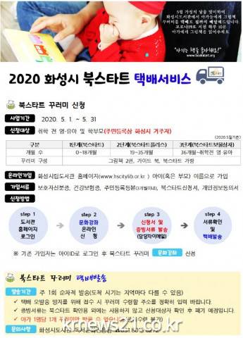 ▲ [사진=홍보포스터]화성시립도서관(이하 도서관)은 관내 영·유아를 대상으로 북스타트 책꾸러미를 집에서 받아볼 수 있도록 5월 1일부터 택배 서비스를 운영한다.
