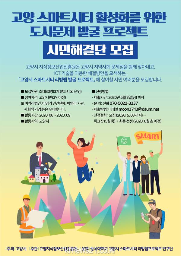 고양지식정보산업진흥원(이하 진흥원)은 동국대학교 스마트시티 리빙랩 프로젝트 연구팀과 같이 5월 8일까지 IT 기술 기반으로 도시문제 발굴을 위한 시민해결단을 모집한다.