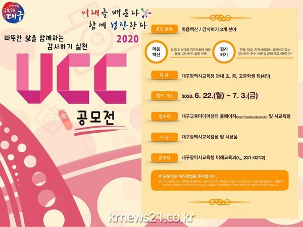 대구시교육청(교육감 강은희)은 코로나19 장기화에 따른 불안․공포를 마음백신인 긍정․감사하는 분위기로 바꾸기 위해 ‘따뜻한 삶을 함께 하는 감사하기 실천 UCC 공모전’을 개최한다.