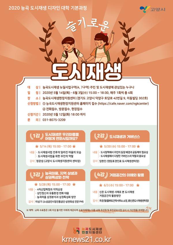 고양시(시장 이재준)는 능곡 도시재생 디자인대학 기본과정(‘슬기로운 도시재생’)을 5월 14일부터 6월 3일까지 운영한다고 밝혔다.