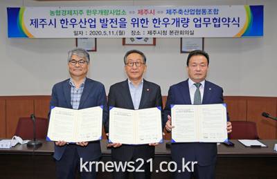 제주시에서는 FTA 체결 및 축산물 수입 개방화 대응, 한우산업의 지속 발전 가능한 기반 조성을 위하여 제주시·농협경제지주 한우개량사업소(소장 김병돈) ·제주축산업협동조합(조합장 강승호) 등 3개 기관이 참여하는 『한우개량 업무협약(MOU)』을 5. 11일 체결한다고 밝혔다.