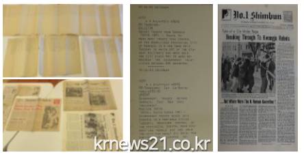 ▲ [왼쪽 상단부터 AP통신 송신용 텔렉스(13장)·외신기자 스크랩(8장)/문화체육관광부 제공]문화체육관광부(장관 박양우) 옛전남도청복원추진단(단장 김도형, 이하 추진단)은 5월 12일(화) 오전 11시, 옛 전남도청 별관 1층에서 기증식을 열고 오정묵(전 광주 문화방송 연출가, 현 오미디어넷 대표) 씨가 기증한 5·18 관련 자료를 최초로 공개한다.