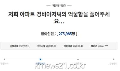 앞서 지난 11일 청와대 국민청원 게시판에는 '저희 아파트 경비 아저씨의 억울함을 풀어주세요'라는 제목의 청원글이 게시됐다.