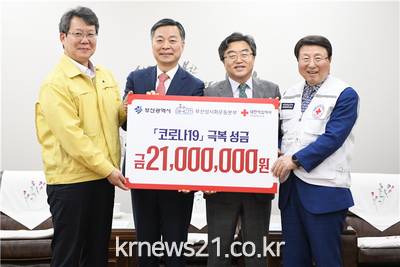 ▲ [사진제공 = 부산시]부산시는 5월 12일 16시 시청 7층 국제의전실에서 (사)부산성시화운동본부 임석웅 부본부장과 대한적십자 부사지사 서정의 회장이 참석한 가운데, 코로나19로 지치고 힘들어하는 소상공인을 돕기 위한 부산지역 목회자들의 사랑나눔 성금(2천1백만 원) 전달식을 개최했다.