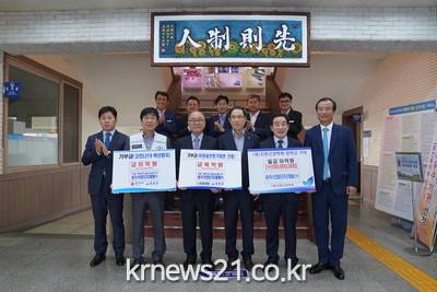 태영건설(주), 삼우건설(주), 진천군 등이 공동출자한 송두산업단지개발(주)이 14일 진천군청을 방문해 기탁금 10억 원을 전달했다.