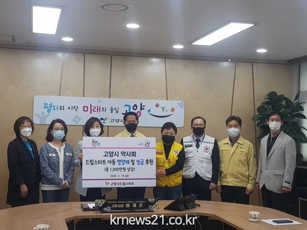 고양시(시장 이재준)는 지난 15일 고양시청 열린회의실에서 고양시약사회(회장 김은진)와 코로나19 위기극복을 위해 생활이 어려운 드림스타트 아동을 돕기 위한 “드림스타트 아동 영양제 및 성금 전달식”을 가졌다고 밝혔다.
