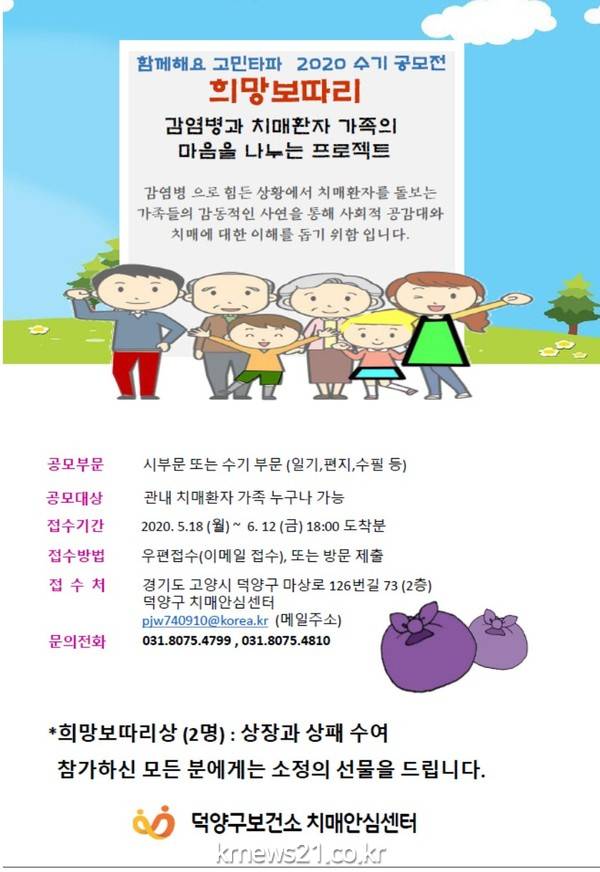 고양시 덕양구 치매안심센터는 감염병과 치매환자 가족의 마음을 나누는 프로젝트 ‘희망보따리’ 치매가족 수기(일기, 편지, 수필 형식 등) 및 시 공모전을 개최한다고 21일 밝혔다.