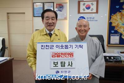 진천읍 소재 보탑사의 능현 주지스님이 21일 진천군청을 방문해 관내 저소득 아동을 위해 써달라며 성금 1천만 원을 기탁했다.