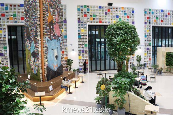 ㈜신세계프라퍼티에서 기증받은 9m 높이의 초대형 북트리 ‘원더랜드’도 만날 수 있다. 세계적인 북 아트 예술 작가인 ‘마이크 스틸키’(Mike Stilkey)의 작품으로, 버려진 책 1만 4천 권의 책을 쌓아 만든 북트리에 익살스러운 그림이 그려져 있다.