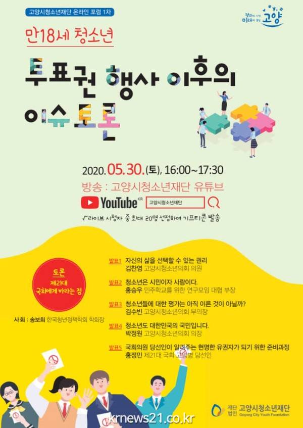 고양시청소년재단(이사장 이재준)은 오는 30일 「고양시청소년재단 제1차 온라인 포럼」를 개최하여 만18세 청소년 투표권 행사 이후의 이슈에 대한 토론을 한다고 밝혔다.