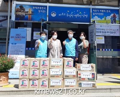 ▲ [사진제공 = 양평군]국민건강보험공단 양평지사는 5월 가정의 달을 맞이하여, 코로나19로 어려움을 겪고 있는 소상공인을 지원하고 지역특산품의 소비를 촉진하고자 말린나물․장아찌․수세미가루 등의 지역특산품과 생필품인 세제․치약․칫솔․커피믹스 등을 구입하여 취약계층 10가구에 전달할 예정이다.
