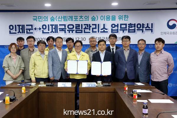 군은 27일 군청 소회의실에서 최상기 인제군수, 임흥규 인제국유림관리소장 및 관계자 등 10여명이 참석한 가운데 인제군-인제국유림관리소 간 ‘국민의 숲(산림레포츠의 숲) 이용 업무협약’을 체결했다.